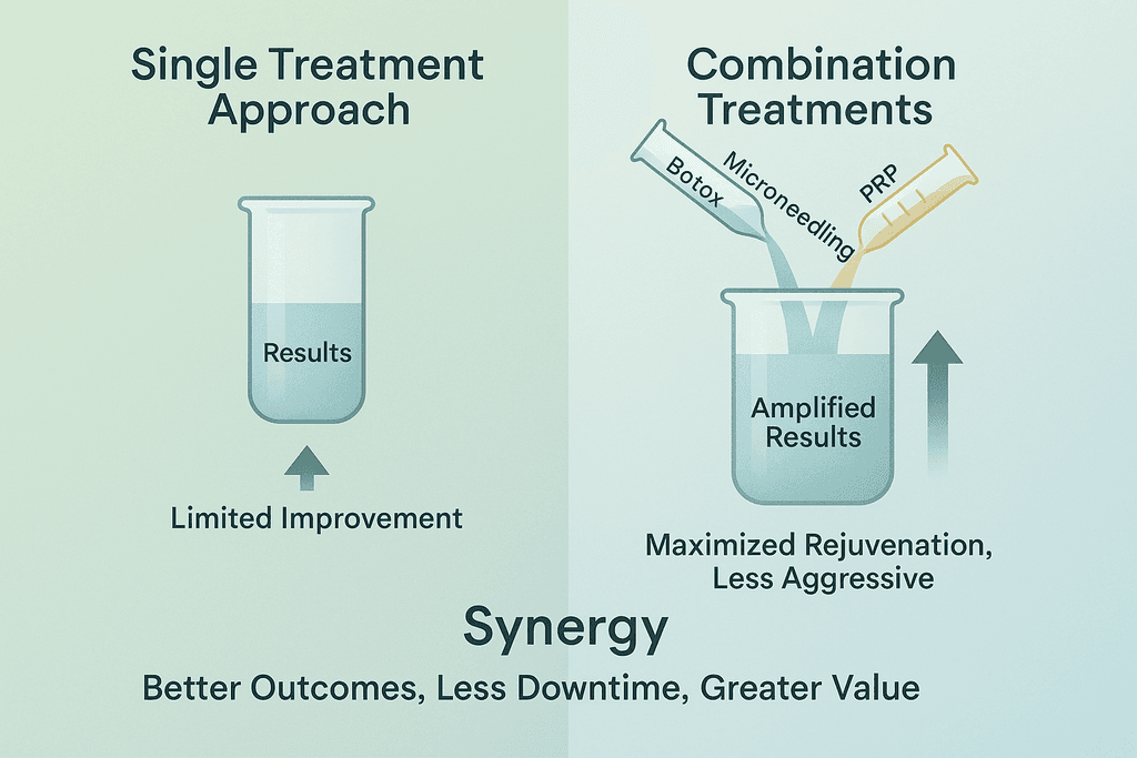 The truth is, aging happens on multiple levels at once. Your skin loses volume while wrinkles form and texture changes, which is why targeting just one issue rarely gives you the results you’re hoping for. When you combine treatments like Botox with dermal fillers and microneedling with PRP, you’re addressing the full picture instead of just one piece of it.