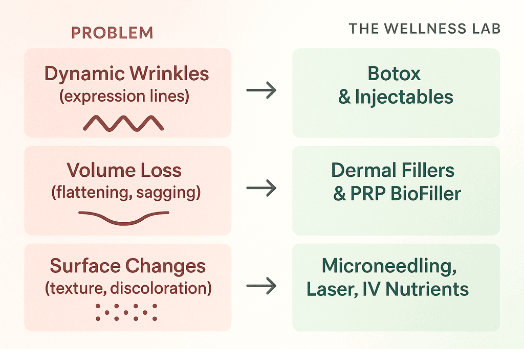 Here’s what most people don’t realize about anti-aging treatments. Each type of aging needs a different approach because they’re happening in different layers of your skin. Treating wrinkles won’t fix volume loss, and adding volume won’t improve your skin’s texture.