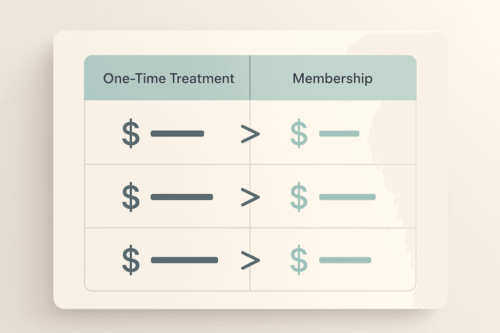 Not every wellness treatment makes sense for a membership model. The sweet spot is services you need regularly, not one-off procedures you might try once and forget about. Think of it like buying in bulk at Costco. You wouldn’t get a membership just to buy a single item, but if you’re going back every month for essentials, the savings become obvious pretty quickly.