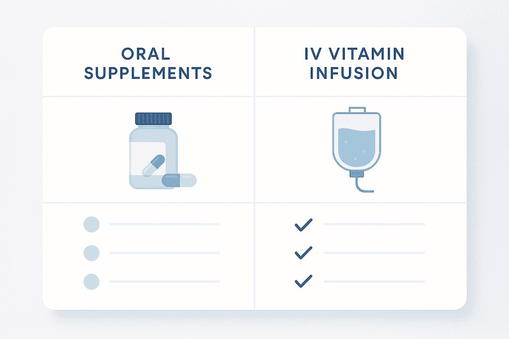 The difference between swallowing vitamins and getting them through an IV is huge when you look at how much actually gets into your system. Here’s what the numbers show: