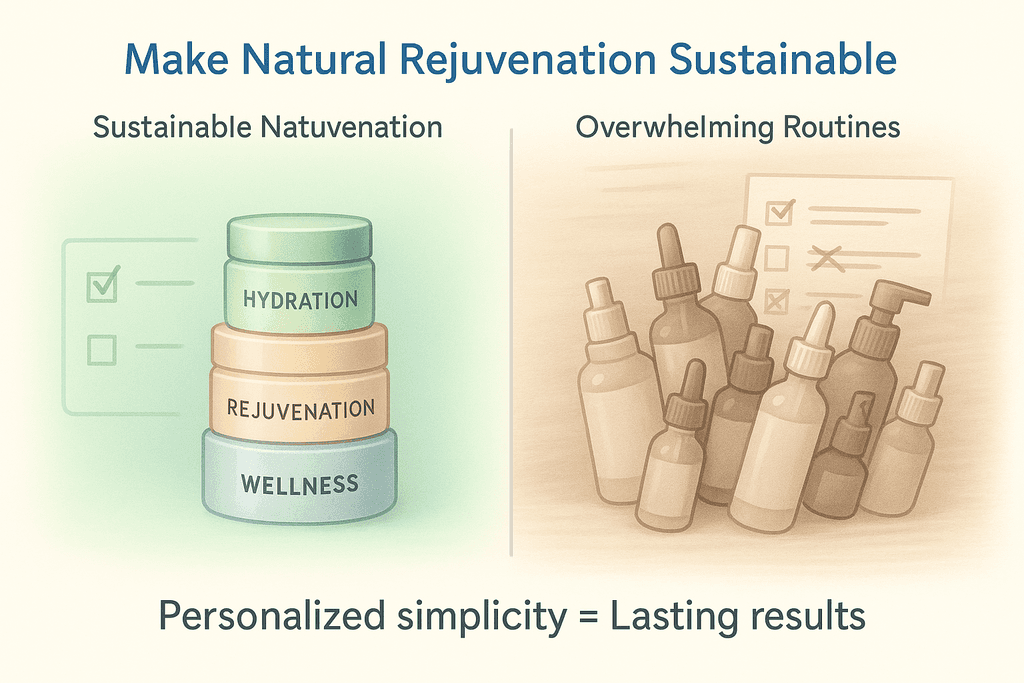 The secret to long-term natural skin rejuvenation isn’t motivation, it’s removing friction. Attach new habits to existing ones, keep products where you’ll see them, and track progress with monthly photos instead of daily mirror obsession.