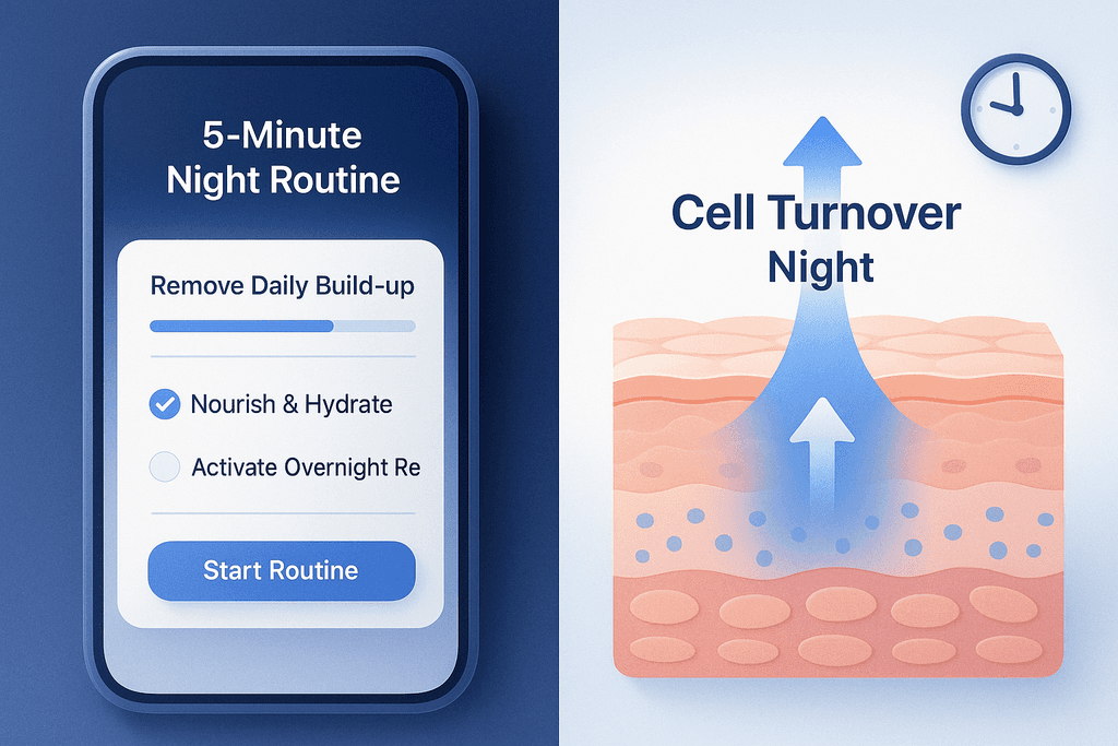 Your skin does most of its repair work while you sleep. That’s not just a saying. Cell turnover actually speeds up at night when your body isn’t busy defending against UV rays and pollution. This is when your evening routine matters most, but it still doesn’t need to be complicated. Five minutes before bed is enough to set your skin up for a full night of recovery.