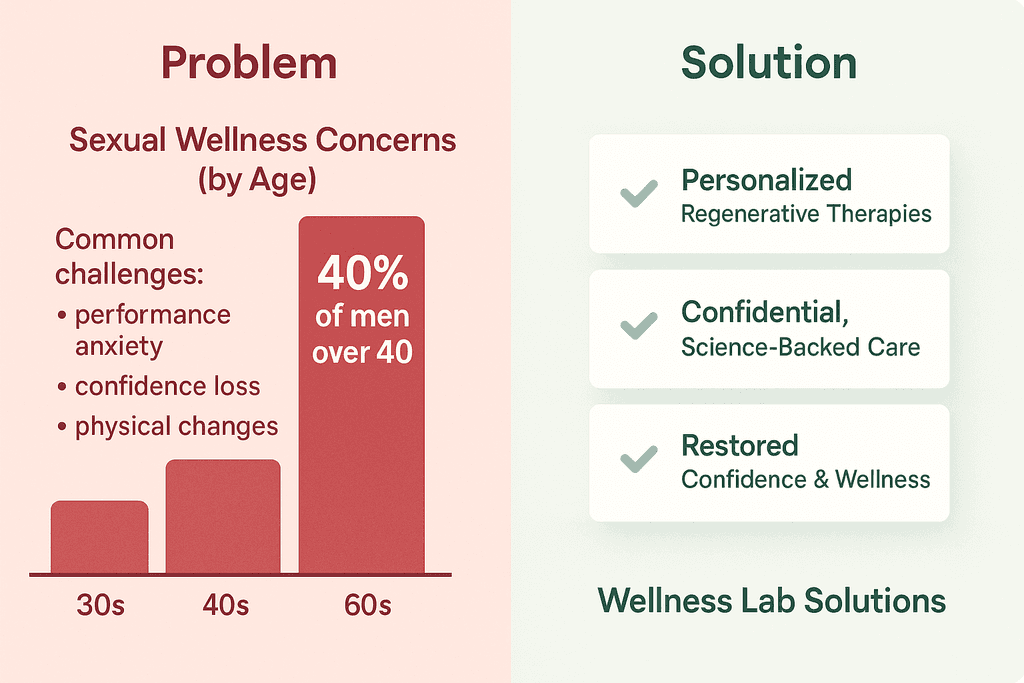 Most men don’t realize that standard pills for sexual wellness only mask symptoms for a few hours without addressing what’s actually causing the problem. Your body has natural systems that can be reactivated to improve performance and confidence from the inside out. At The Wellness Lab, our sexual wellness for men treatments use regenerative therapies that work with your biology instead of against it.
